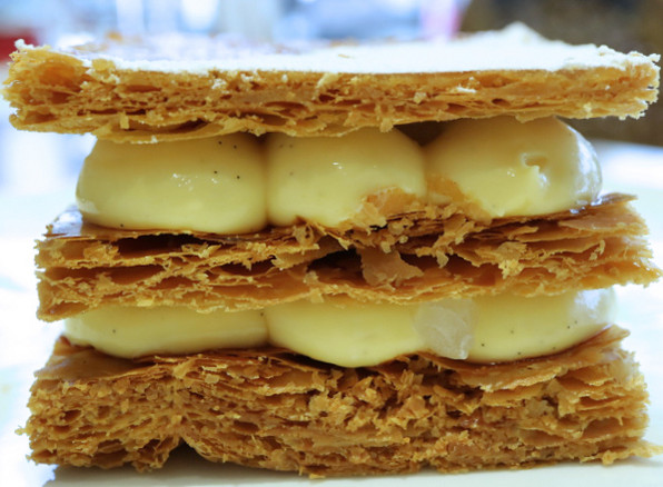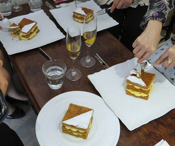 ●そしてメインとも言うべき、ミルフイユです。このサクサクサクサクの、何度も折りたたみ、折りたたみ続けることで文字通り千(Mille)ほど重なっているフイユタージュ、今やとても高価な貴重品となっているヴァニラの粒粒がたっぷり入ったクレームパティシエールがまた目を剥くほどおいしい。シャンパーニュのジュレ仕立てがほとんど粒粒の細かさで散らされており、香味のアクセントになっています。わたし自身は実はこれ、そんなに要らないと思っているのですが(ごめん)、でも皆さんには圧倒的に好評でした。(普通はやっぱりこういうアクセント必要なんだな。。。わたしが極端なだけで・・・<(_ _)><(_ _)>)