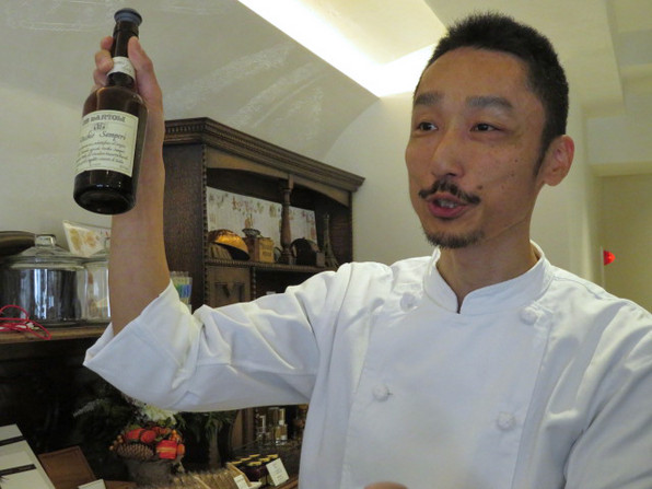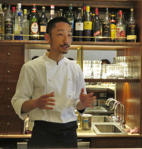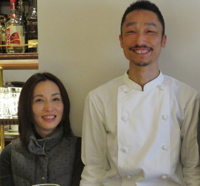●5席のL字型カウンターの向こうには、バーか?と思うほど洋酒が並んでいます。洋酒を巧みに使うシェフの中元修平さんです。マダムの薫さんと。