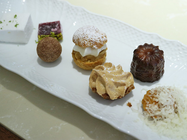 ●2度目の飲み物(選択いろいろ)と共に、小菓子7種類。ギモーヴ、パートドゥフリュイ、ショコラ、パリブレスト、カヌレ、サレのものなど。小さいながら、それぞれが味わい明確、ものすごく美味でした。