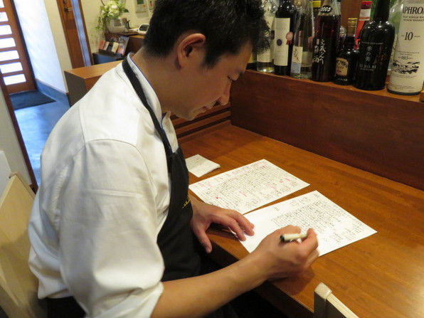 ●いつもの日替わり手書きメニューを書くのろっち=野呂和美さん。扱う食材が、行くごと増えていっています。お店がどんどん回っている証拠です。