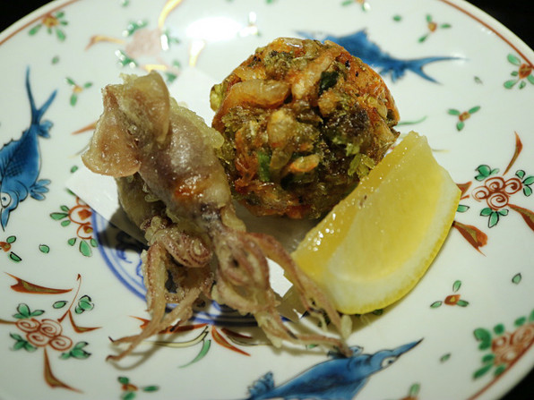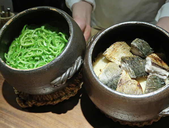 ●天ぷらはアスパラガス、ヤングコーン、稚鮎、見えないけれどそら豆。この魚の器は初めて見ました。秘蔵の器だったとか。