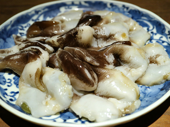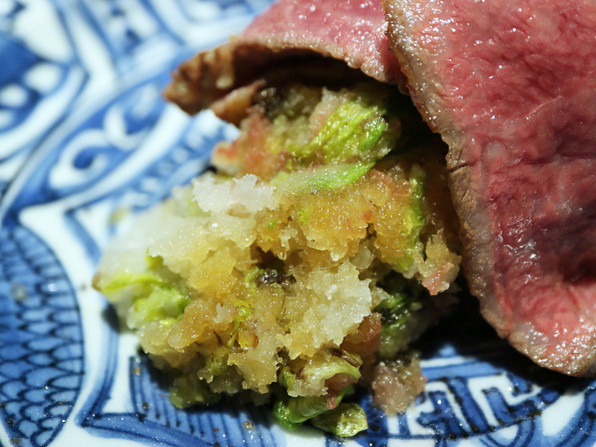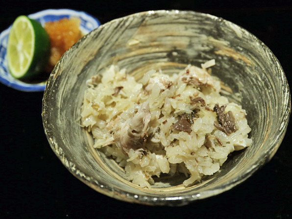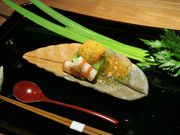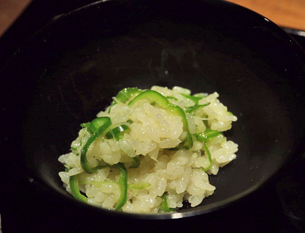 ●八寸は、グラス入りのじゅんさいから時計回りに、もずくと蛸(これは鯛。わたしは蛸食べない)、からすみ、すずきの幽庵焼き、白ずいき。たいら貝、百合根、きゅうり、三つ葉の和えたの。