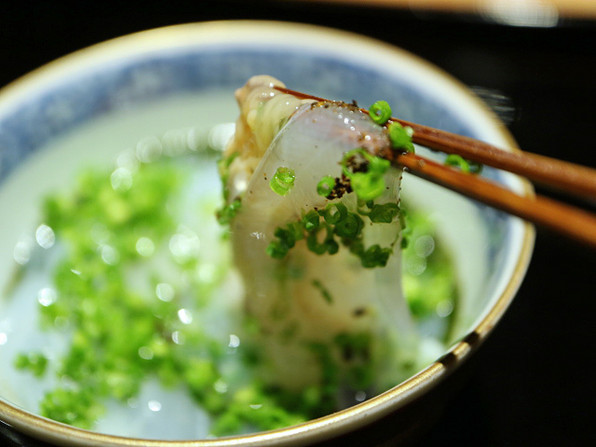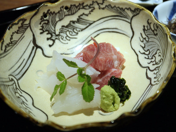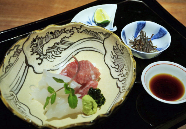 ●お造りは鯛が薄造りで出てきました。ちり酢も添えられました。
