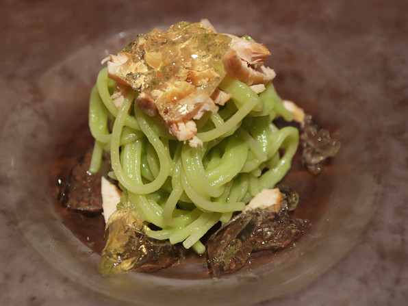 ●細麺・フェデリーニにえんどう豆のクレマをからめたもの、鮎の魚醤のジュレ、桜ます