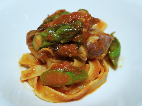 ●幅太麺・タリアテッレ、ほたるいかと緑アスパラガス、トマトソース、ケイパー
