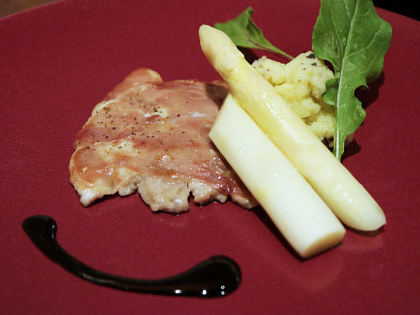 ●宮崎産 観音池ポークのサルティンボッカ 香川の白アスパラガス、トリュフ入りマッシュポテト、黒にんにくソース