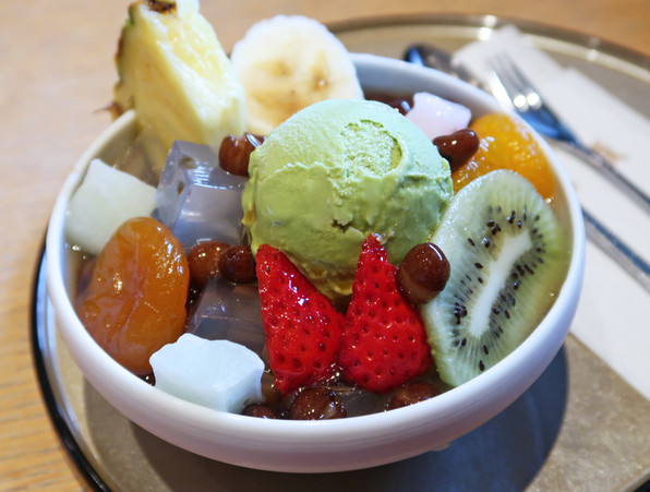 「月ヶ瀬」さんの堺町店で、抹茶クリームみつ豆 950円。