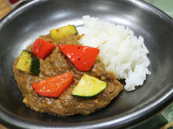 これが「とくをのまかないカレー」。夏野菜がのって、風味を添えます。彩りも美しくてよいです☆☆☆