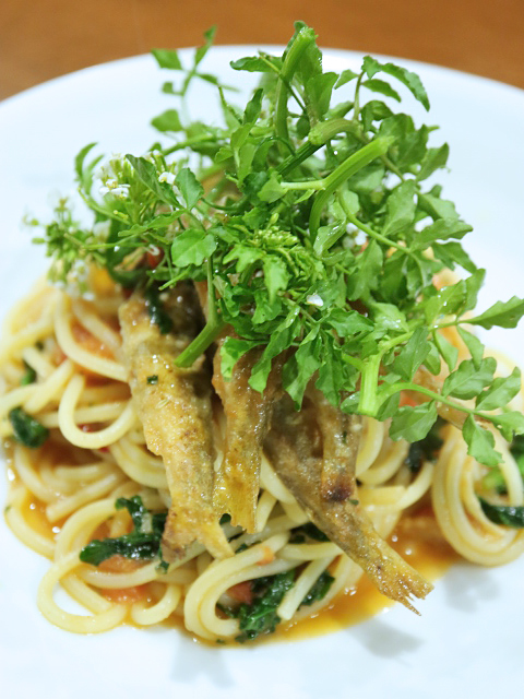 ●粉を打って焼いた稚鮎がたっぷりのって、これをくずしからめもってパスタを食べました。クレソンの苦味も効いて調和して、おいしかったーーーーーーーーーーーーーー\(^o^)/\(^o^)/☆☆☆