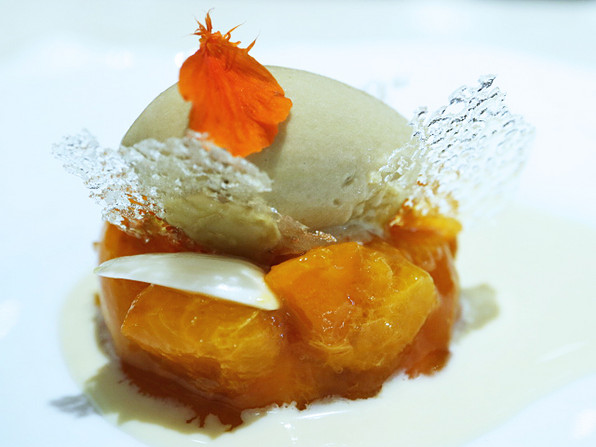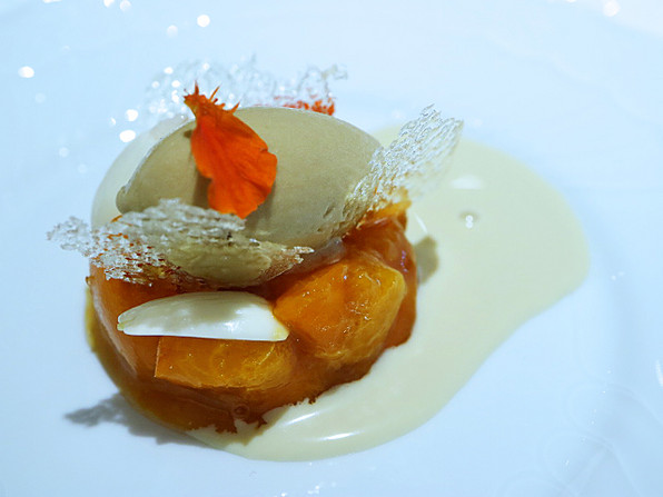 ●肉厚のアブリコ(アプリコット)の、コンポートと生、黒糖アイスクリーム、生のアーモンドのスライス。ソースはエルダーフラワーに白チョコレート。味が粋、酸味と甘みが押し寄せて美味のかたまり、ソースが甘みと香りを添えて、圧倒的にすてきな一品。おかわりと叫びそうになったお皿。
