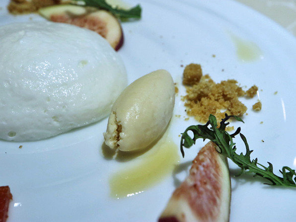 ●これがまたすごいバランスでした。山羊フロマージュをエスプーマにしたものに、わらの香りのアイスクリーム(これがもうれつフランスの香り)、いちじく、わさび菜。かりんのジュレが香りを、クランブルが食感を添え、香味濃厚なはちみつがニュアンスを添えました。レストランで繊細優美なお料理をいただいている気持ちになりました。