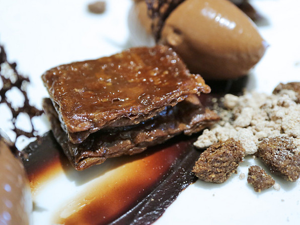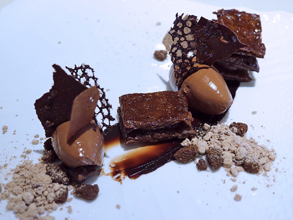 ミルフイユ、クレーム、パウダー、クランブル、ソースとショコラの4段か5段活用という感じで、食感の違いを楽しみました。パリパリ、さらさら、ねっとり、サクサクサク。迫りくるショコラの味と香り。トンカ豆の香りも添えられて、わたしには天国的なお皿。ほんとーーーに幸せと思えました。