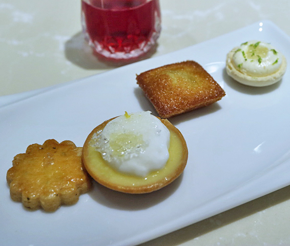 ローズマリーのクッキー/レモンタルト、ヨーグルトムース、シトロンコンフィ/ラヴェンダーの香りの(フィナンシエに見えるけれど)マドレーヌ/カルダモンのマカロン、シャンパーニュのジュレ、ライム、バタークリーム。