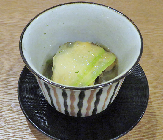 ●先付は蒸しあわび、ずいき、冬瓜、天然のじゅんさい、青瓜