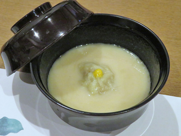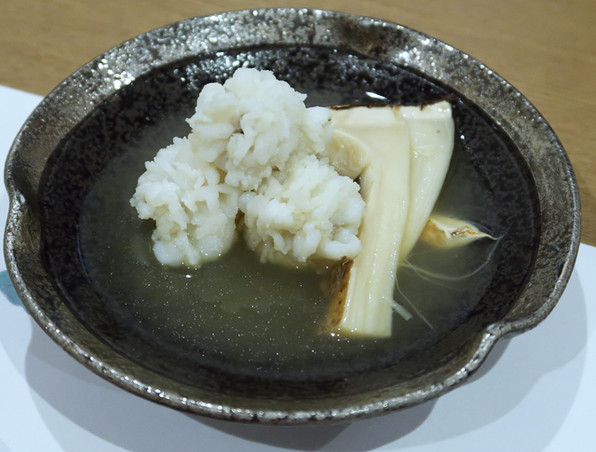 厨房全見えの割烹らしい造りの割烹で、夏のお料理をいただきました。熱いもの冷たいものがほぼ交互に組み込まれていいバランス。鴨まんじゅう白味噌仕立て、バリバリの鮎焼き、冷たいにしん茄子など実に美味でした。そして鱧と松茸の焚き合わせが料理の最後に出てきていい締めくくり。