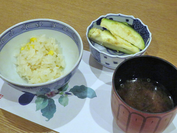 ●とうもろこしご飯、水茄子、味噌汁。