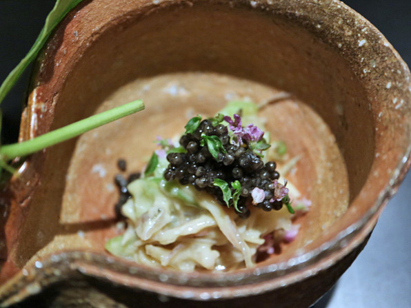 ●鮎のせごし、茗荷、青瓜の酢味噌和え、上にカヴィア、花穂紫蘇。ひと品めから完璧な調和、完璧なおいしさ。