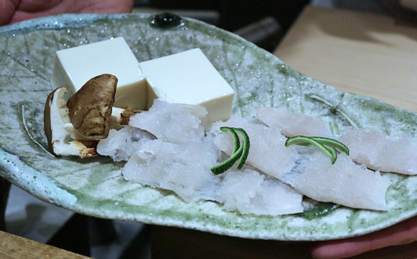 ●鱧しゃぶと鱧のお椀の材料のプレゼンがされて、目の前でしゃぶしゃぶをしてくださいます。