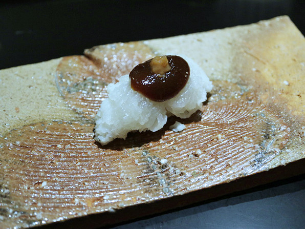 ●冷たい玉露ひと口、竹筒のお酒を食前酒にひと口いただいた後に先付です。葛の葉をあしらわれて供されました。