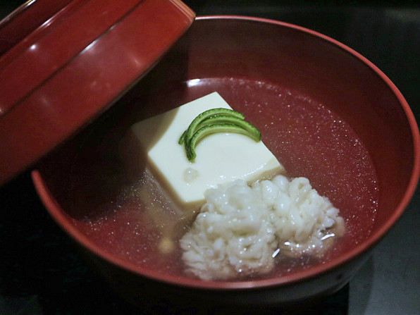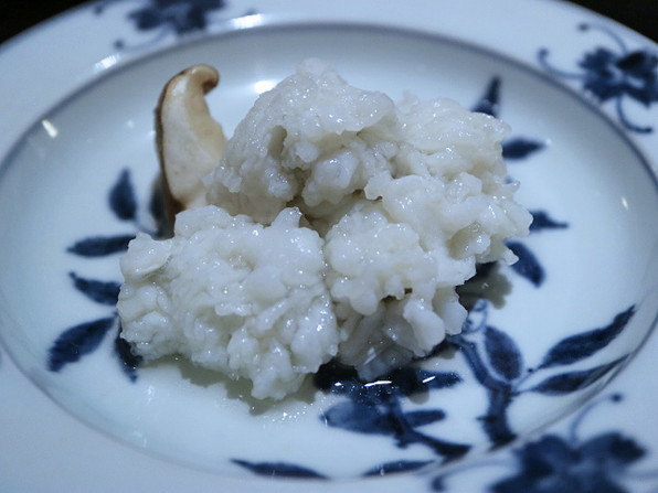 ●ここで初のおこげ! パリパリで心地いい食感でした。湯引きした鱧、下に夕顔(ウリ科)、白アスパラガス。梅風味のあん。