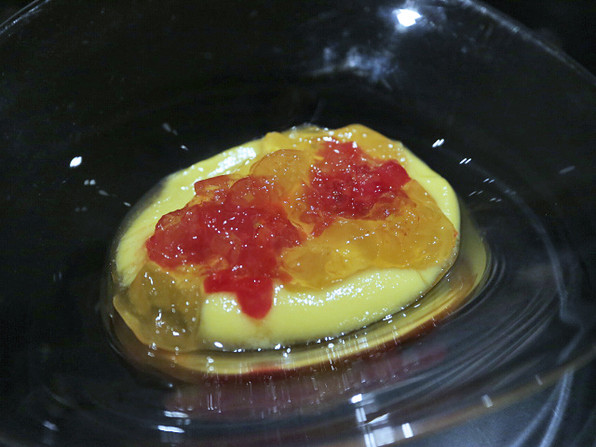 ●とうもろこしのすり流し 刻んだトマト、中に枝豆、上からお酢のジュレ。