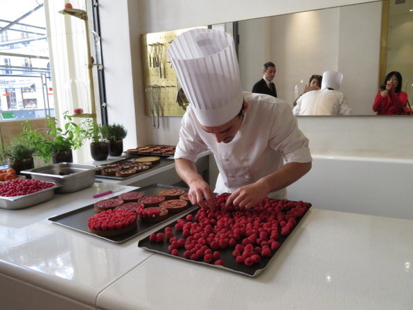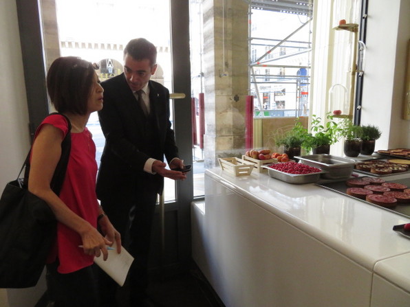 大森由紀子「ル・ムーリス」のパティスリを取材する之図です。シェフパティシエのセドリック・グロレさんは不在だったのだけど、対応してくれたバンジャマンさんやナツミさんがとても感じがよかったです。