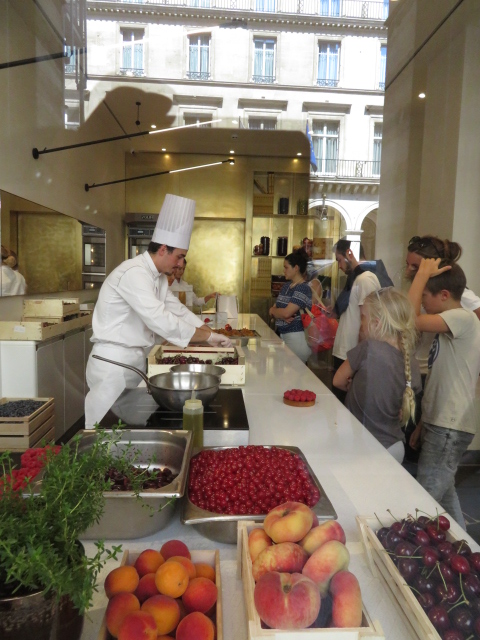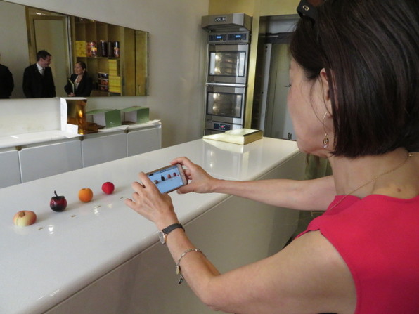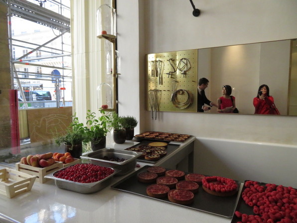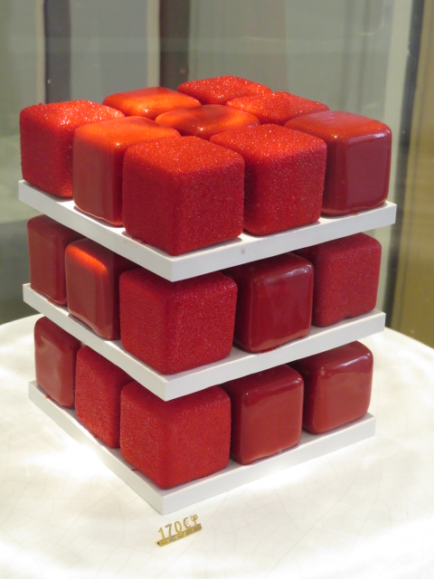 「ここで、お客さまと話しながらお菓子を仕上げます。シェフが、何なりと質問にもお答えします」って言われたら、「タダで?」なんてゆきぴーすかさず聞くもんだから、やっぱりこの人大阪人みたいだー\(^o^)/\(^o^)/と笑って、わたしも「何か買ったらですよね?」と合いの手入れたら「いやタダで、買わない方にも何でもお教えいたします」なんてものすごく丁寧に答えてくださって、でも買わない客がここまで来るはずがないじゃないね?(^o^)(^o^) バンジャマンさんとゆきぴが話す様子の動画も撮って、始終笑ってばかりの取材でした。季節でいろいろ変わる、名物キューブは170ユーロだって。(*_*)(*_*) ものすごく大きいけれど。それも素材によって値段変動するみたい。