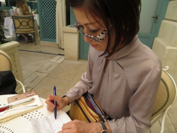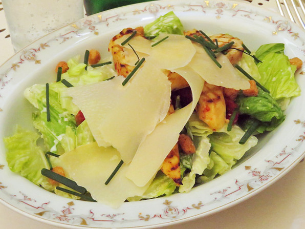 大森由紀子の知り合いの方がいらしてありがたくも厨房を訪れて見せてもらったりした後、テラスに出てごく軽くデジュネ。鶏肉サラダ。