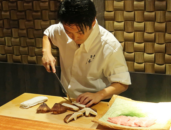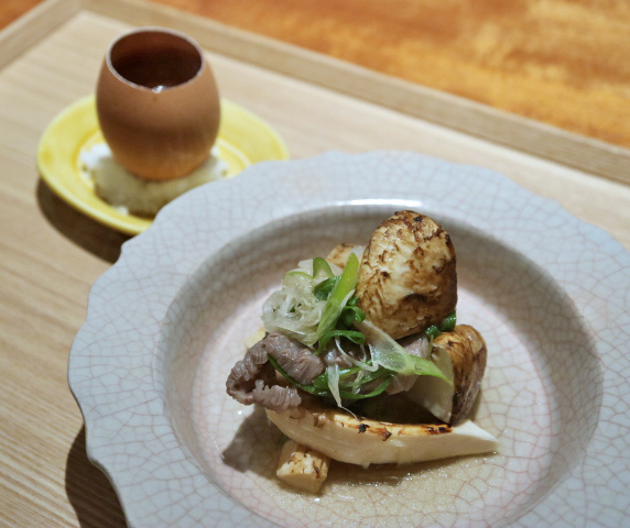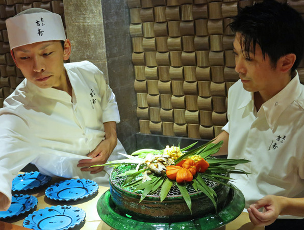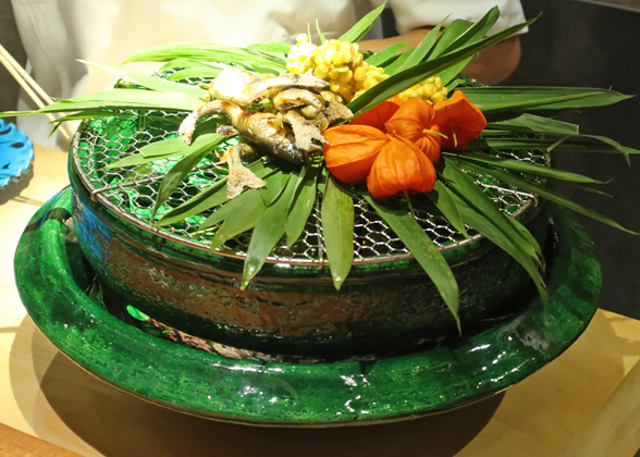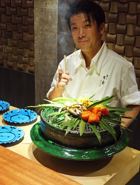 信楽の中川一辺陶さん作のお鍋や、見たこともないデザインの燻し器や焼台がどうだどうだと次々出てきて、目の前で吉寿さんが焼いてくれたりしゃぶしゃぶしてくれたり、そのたびちゃんとポーズとって(笑笑笑)、いちいち見せ場があるわけ。