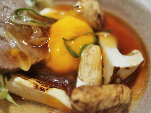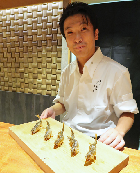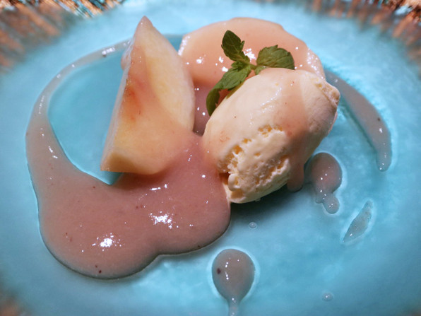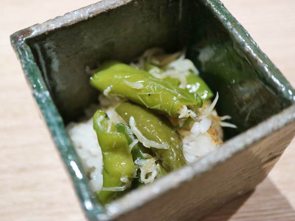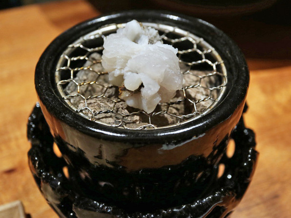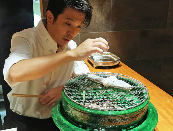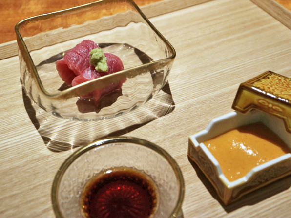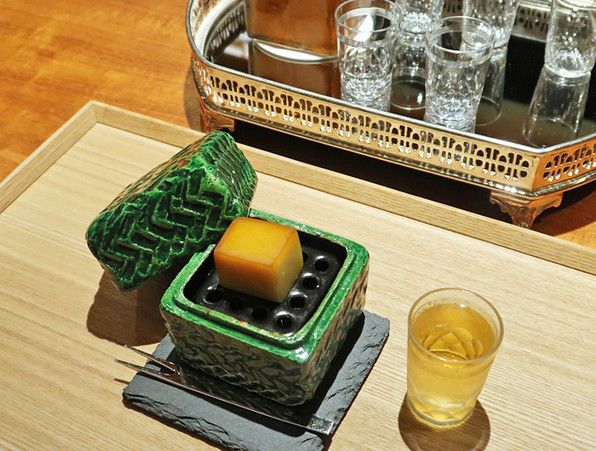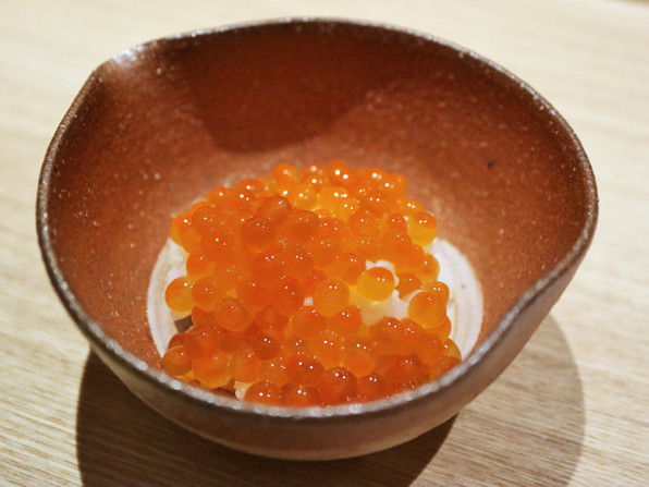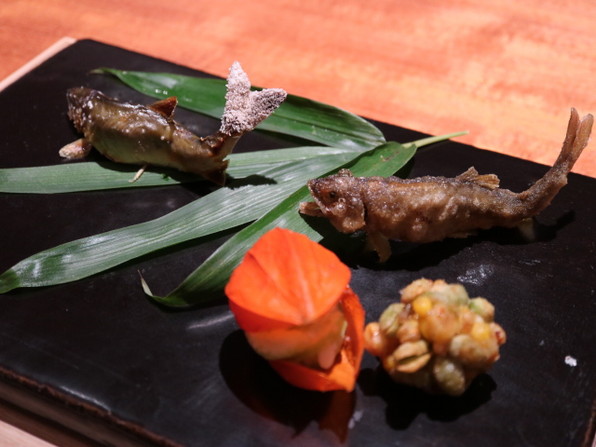 ●まぐろでも、そのままわさびと醤油で食べるのと、少し炙って塩辛卵黄酢で食べるのがあったり、鮎もシンプル塩焼きと揚げてから焼いたのと2種類あったり、さらに牛肉もシンプルしゃぶしゃぶと、すき焼き風味にするのと2度食べさせてくれたりして、飽きないわ、楽しいわ、心を奪われるわ\(^o^)/\(^o^)/\(^o^)/ チーズの燻製とミニハイボールなんかも出てきました。ご飯はいくらご飯と万願寺ちりめん山椒ご飯の2種類でした。デセールも目の前で仕上げて、店主さんの手元にみんなの視線が集中するようになっています(^o^)(^o^)