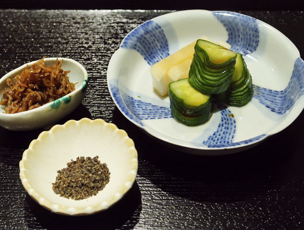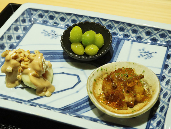 ●酒肴3品。銀杏/えのきみぞれ和え/いちじくに胡麻だれ、松の実
