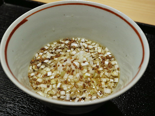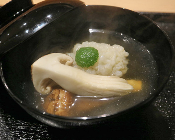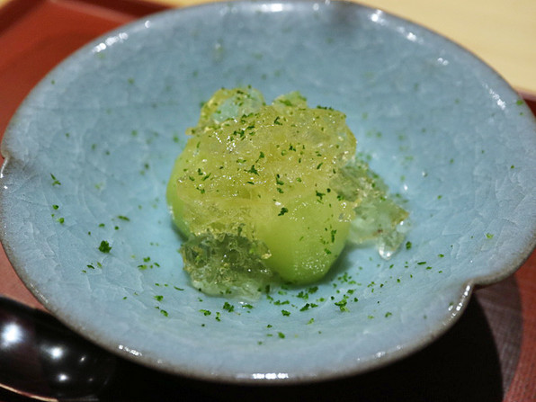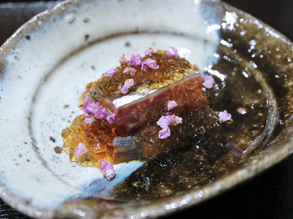 ●ひと皿め、あわびなのですが、これはさんまのづけ。少し濃いめのおだしジュレ。