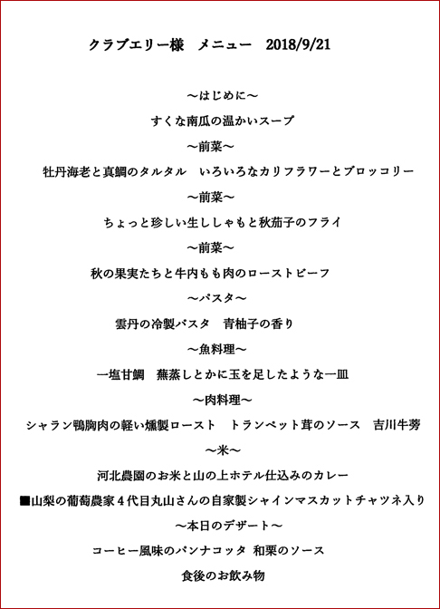 「リストランテ 野呂」で9月21日(第3金)お昼にクラブエリーをお願いしたのでした。