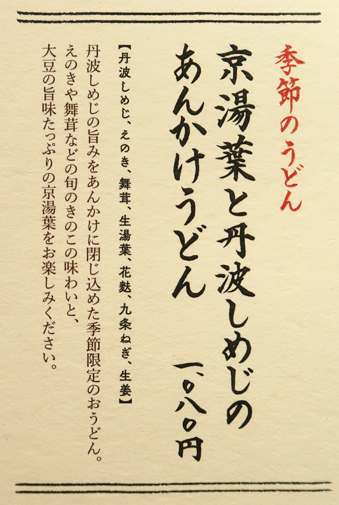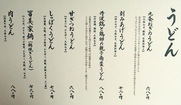 ●品書きは堺町通蛸薬師下ルの「冨美家」さんと少し違って、九条ねぎや京湯葉や丹波地鶏を使ったうどんを全面に出して、より京都らしさをアピールする品揃えになっていました。