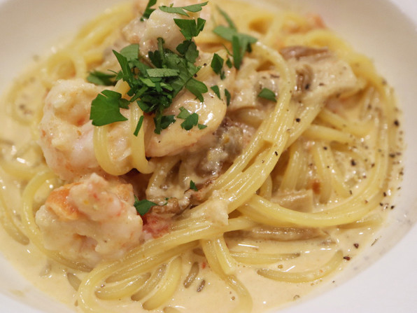 ●ポルチーニと甘海老のクリームパスタ、アンチョヴィの香り