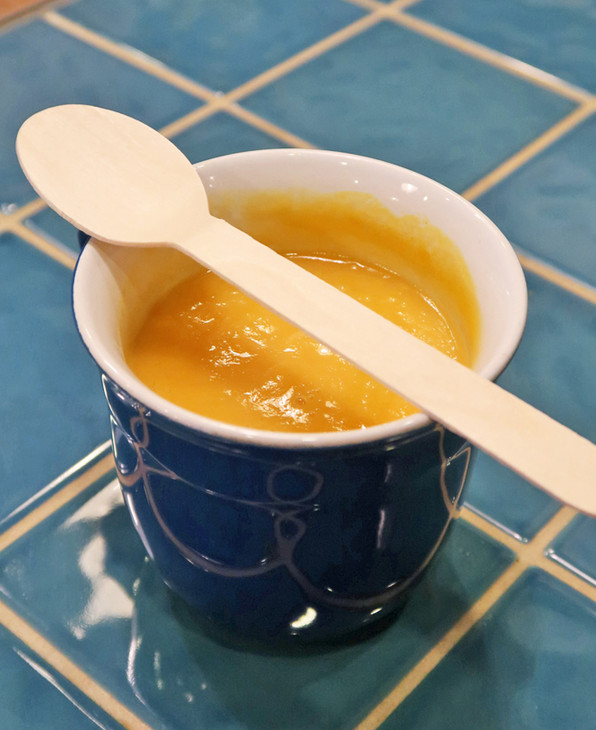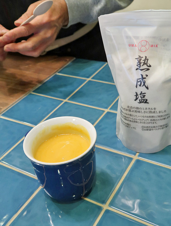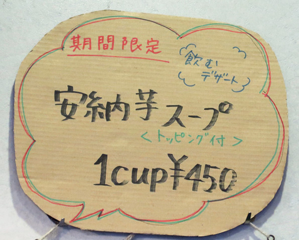 ●豆乳ベース、甘い安納芋に、なんとみかんの酸味を足したユニークな味。わたしは塩と胡椒を少し足してもらっていただきました。