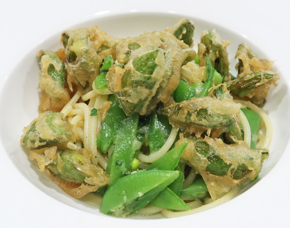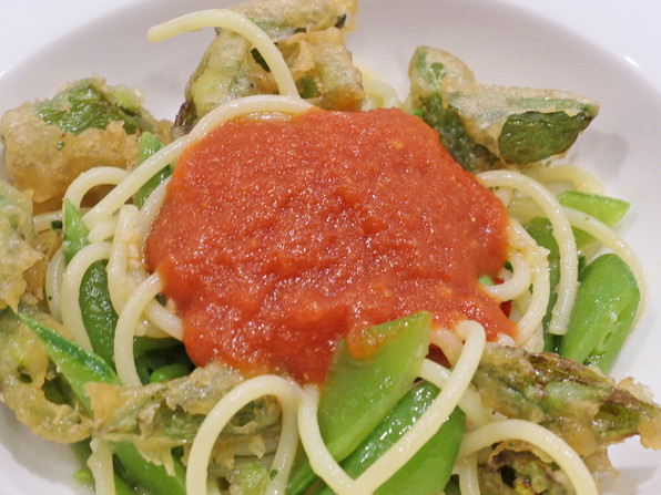 ●スナップえんどうの、天ばら→トマトソースを足して天茶となるパスタ。