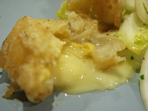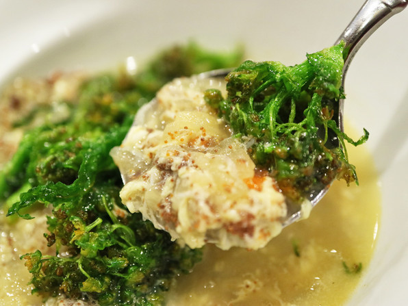 こっぺ蟹の玉子とじスープ、上に菜の花パリパリ素揚げ、