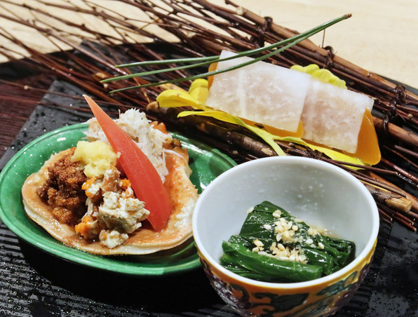●修学院のほうれん草のお浸し、こっぺ蟹、からすみ大根。