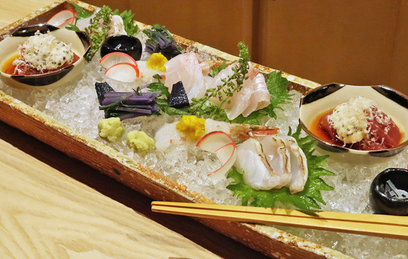 ●明石の鯛、以下は全部長崎からのもので、牡丹海老、ふぐの焼霜、まぐろ。赤水菜、赤大根、菊花。醤油と、レモンの入ったちり酢と。