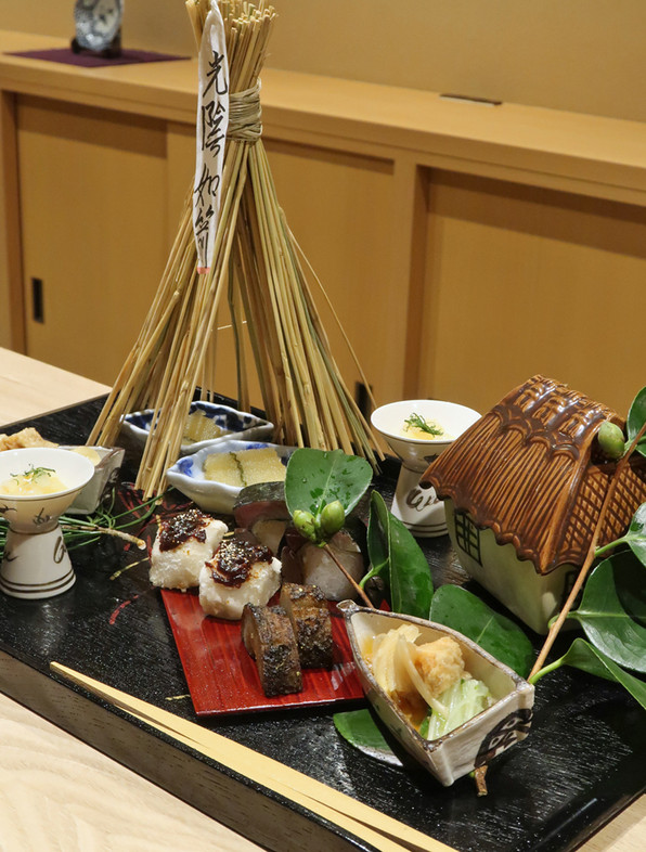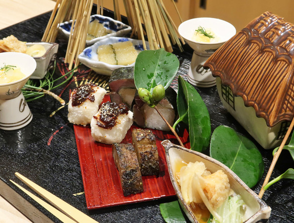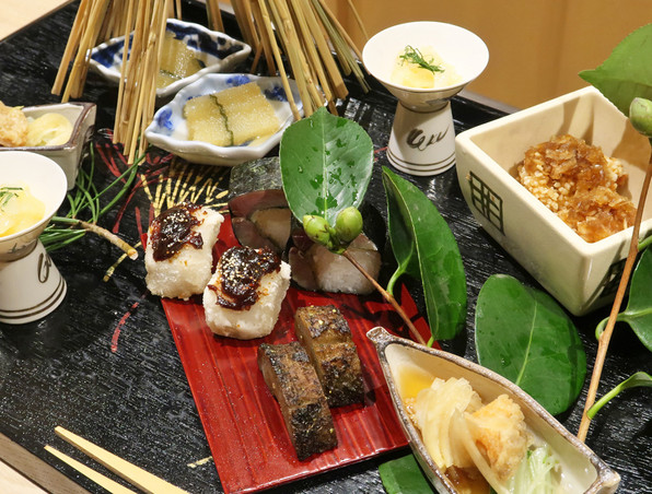 ●のどぐろ南蛮漬と水菜/子持ち昆布/烏賊の塩辛和えの鯛/鯖寿司海苔巻き/小芋田楽/堀川ごぼう/雲子の香煎揚げ、玉ねぎぽん酢