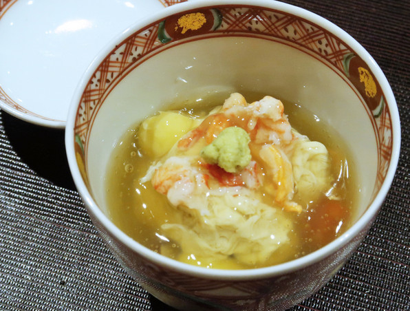 ●蒸し物でした。湯葉、かぶら、さわら、銀杏、むかご、金時人参、蟹。