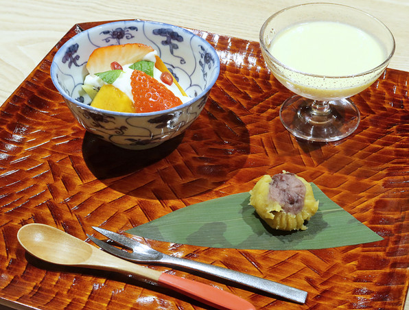 ●温州みかんのブランマンジェ、安納芋のきんとん、フルーツは、牡蠣、キウイ、いちごに、卵白を使った白いソース。