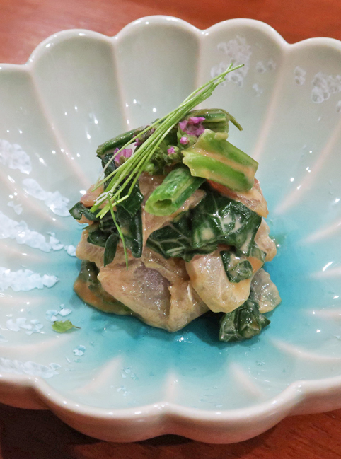 ●前菜、生ものが4皿です。その1が、連子鯛とほうれん草の胡麻和え