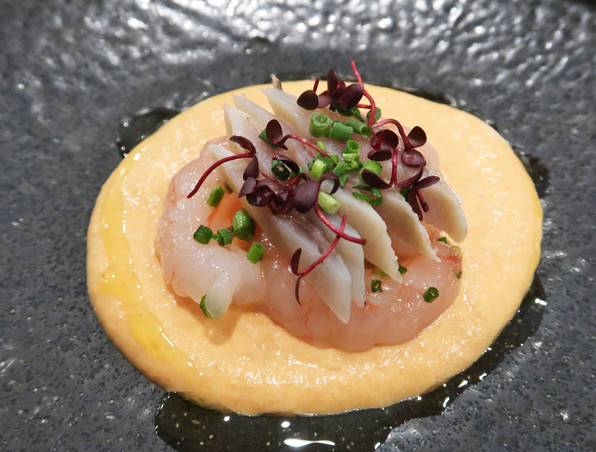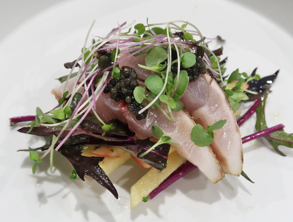 ●その3が、高知のひと塩のひらあじ、生姜の香り、カヴィア。下に敷かれているのは、