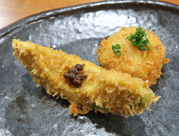 ●手前がアボカドのフライ、向こうが本ずわい蟹のクリームコロッケ。