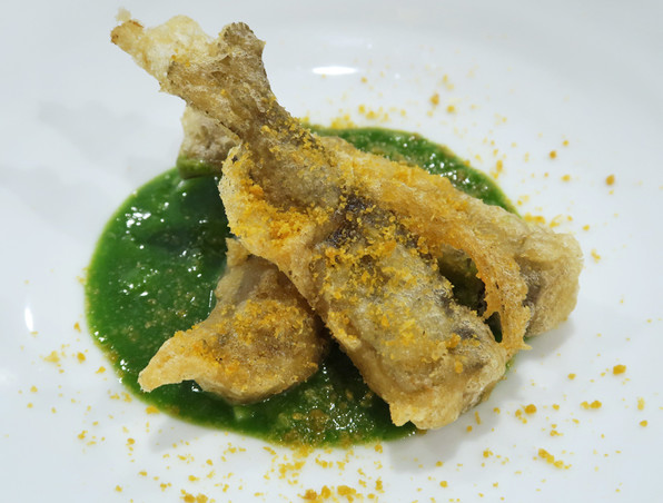●いさき、ブロッコリーの素揚げを中に巻いています。蕪のピュレ。きんかん、雲丹。