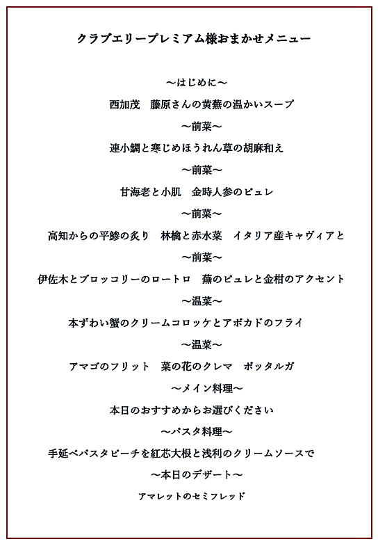 月に一度、クラブエリープレミアムのメンバーの中から希望者2名ずつくらいをお誘いして、いつものりすのろの夕食を楽しむという企画です。いつも通り、日曜の20時半スタートです。