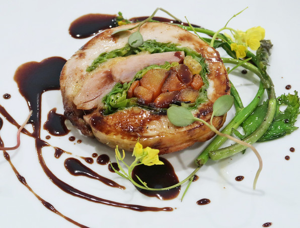●メイン料理はほろほろ鳥のインヴォルティーニ。ちりめんキャベツ、にんじん。鶏だしとバルサミコのソース。