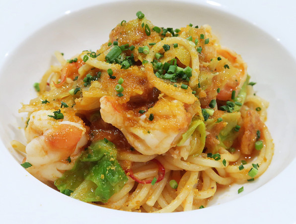 春キャベツと海老のスパゲッティ、からすみ。ほんのりトマト味。おいしーい\(^o^)/☆☆☆